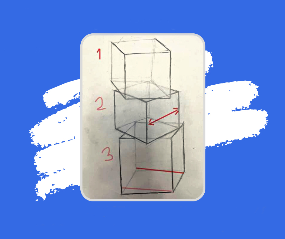 Линии не выровнены с перспективой, что создает искаженное восприятие объема и пропорций. Куб 3 воспринимается больше, чем 1 и 2, но должен быть одного с ними размера.